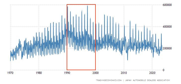 Com mais volume de dinheiro proveniente de salários, isso aquecia o consumo interno, o que pode ser comprovado pelo índice de registro de carros novos no Japão, que nos anos 90 também atingiu seu ápice.